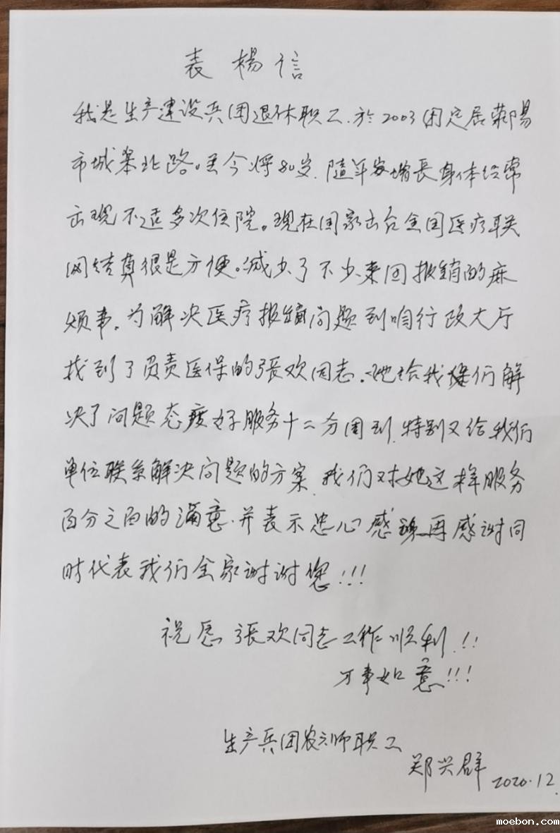 15日 上午10时,80岁高龄的郑老先生来到医保窗口咨询业务,郑老先生已在参保地新疆社保经办机构办理异地就医备案手续,在我市定点医院住院报销时,却遇到了难题。在得知老人情况后,窗口工作人员张欢第一时间与市人民医院取得联系,询问相关情况。在得知是医院未能接收到异地就医转诊信息后,又主动与原参保地新疆社保经办机构取得联系,积极协调沟通相关事宜,提出解决方案,确保异地就医转诊信息成功接收。老先生在信中真诚的写到:“我对这样的服务百分之百满意,并表示衷心感谢。”这封信不仅是对医保工作的鼓励,更是对我们服务的肯定。