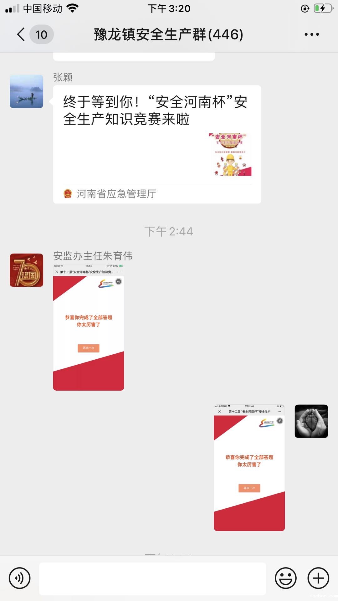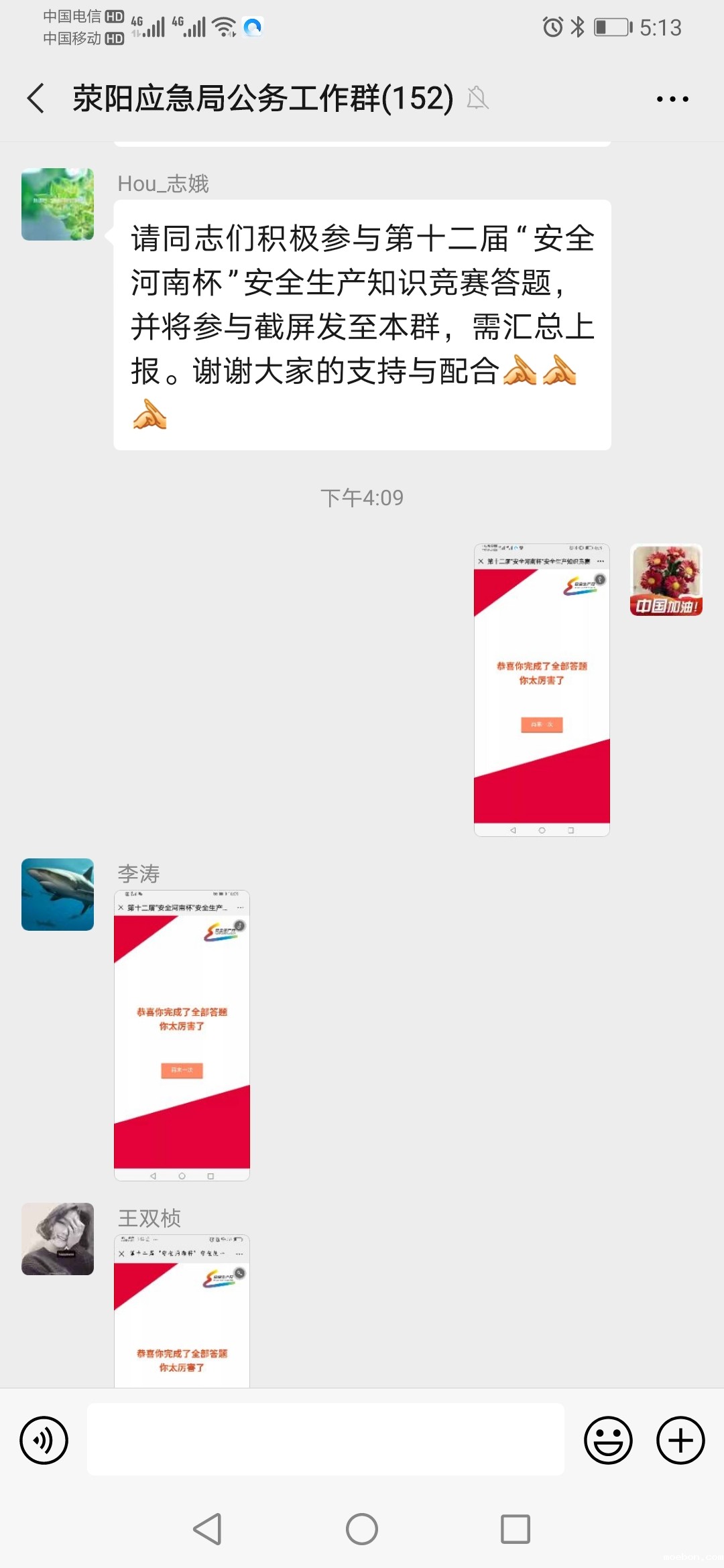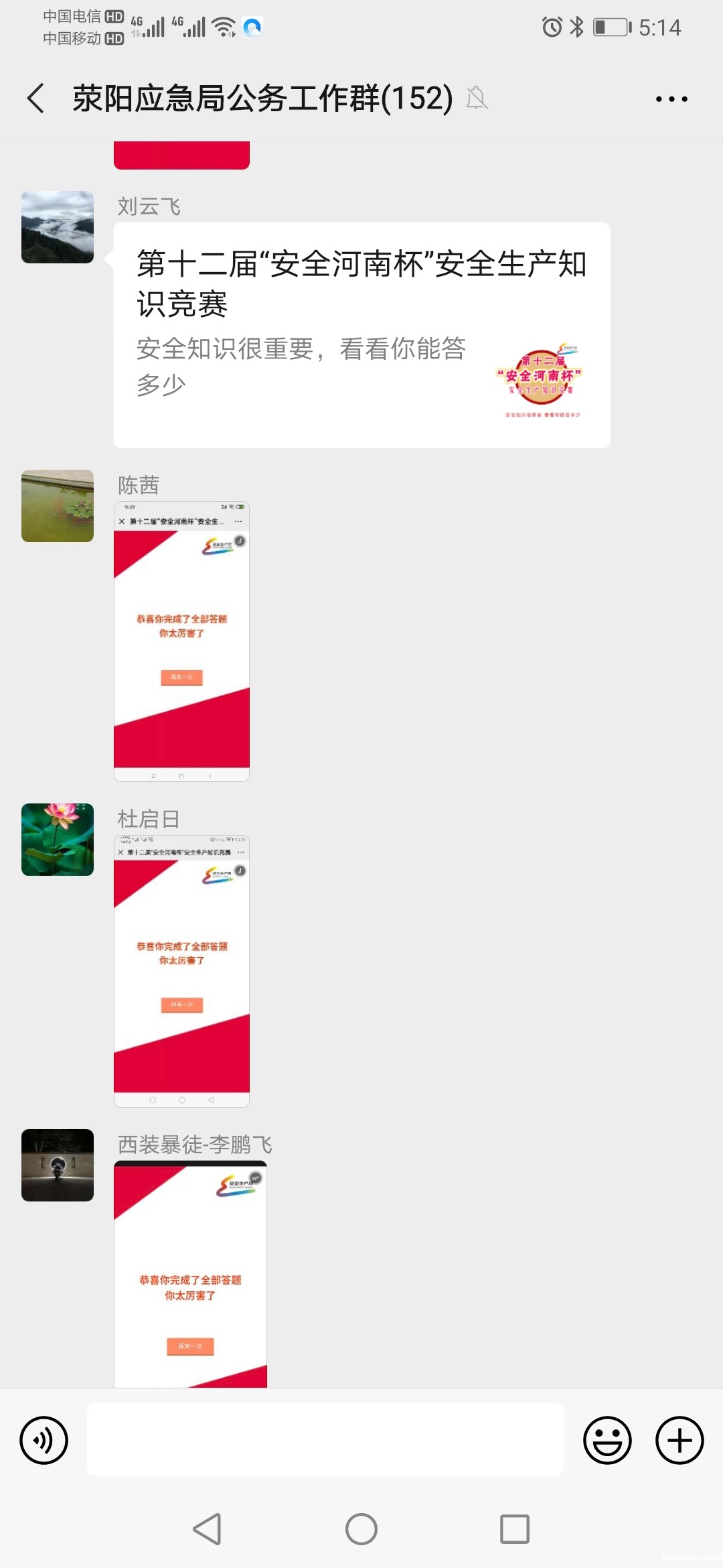 6月2日,荥阳市应急管理局、豫龙镇政府通过微信群组织机关干部、企业积极参加“安全河南杯”安全生产知识竞赛网上答题活动。