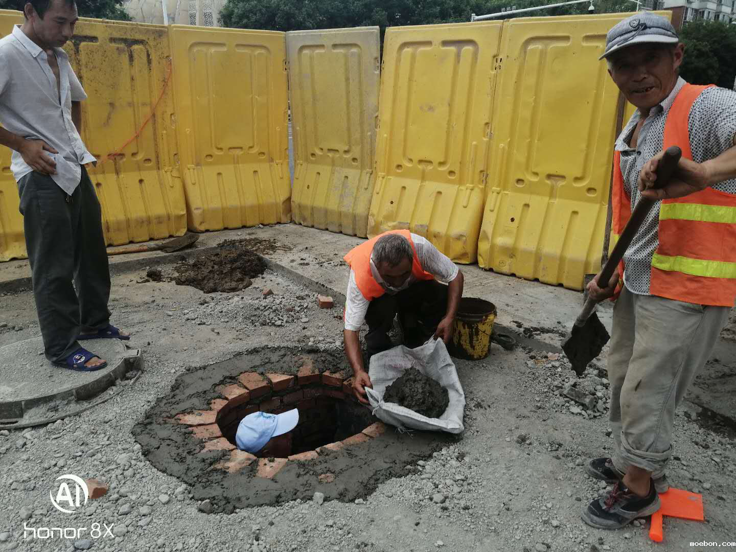 索河路三公路交叉口慢车道塌陷处位于人流密集的繁华路段,在修复塌陷的同时还要对损坏的污水井进行修复,在井内作业,空间狭小,施工人员展不开手脚,为了尽快完成施工,恢复交通,工人们想尽一切办法,真是拿出“绣花”功夫。