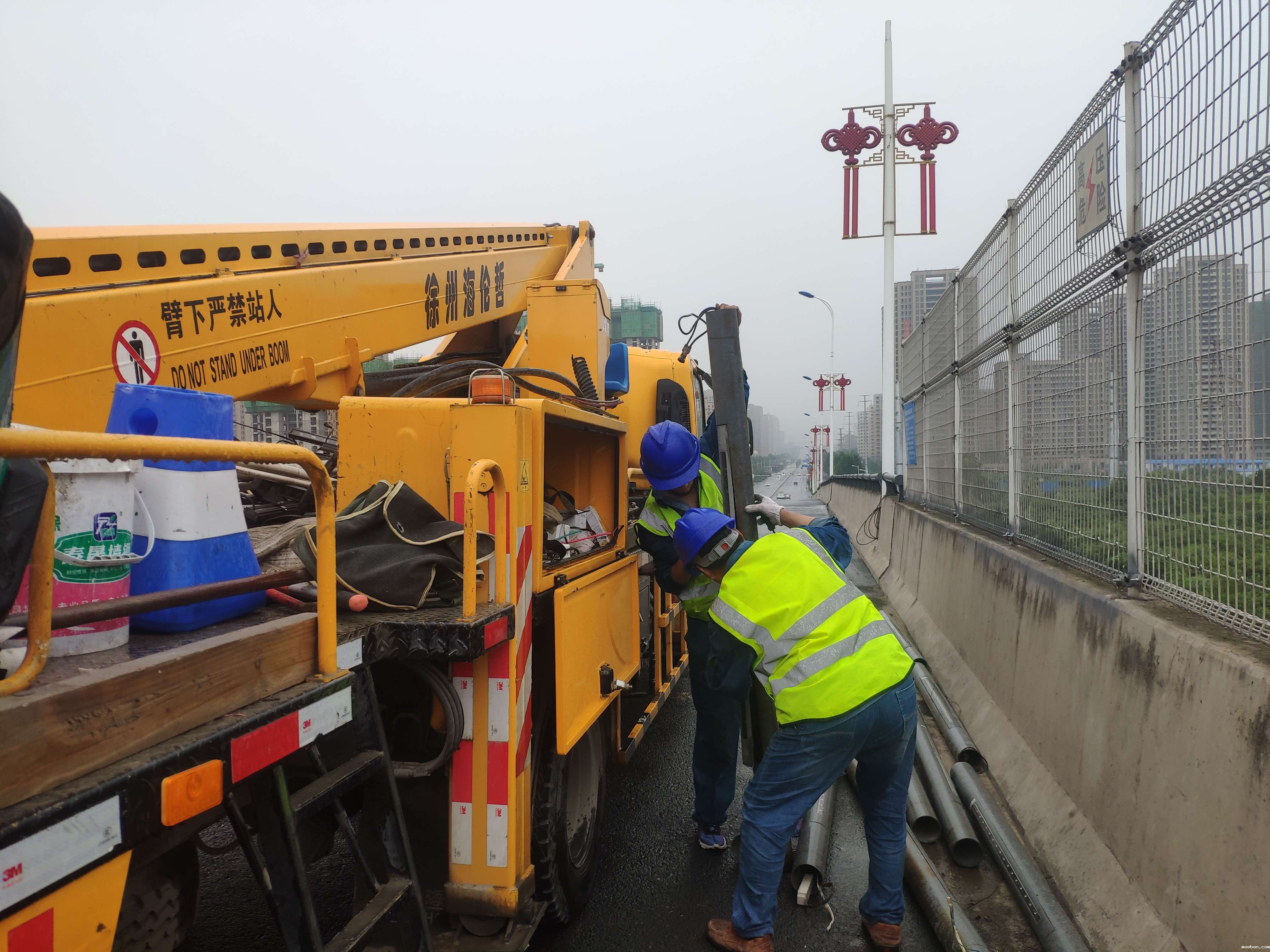 此次隐患排除,既要在铁路部门的监督指导下,又要充分结合铁路部门的运营间断空闲时间,施工过程中也要全封闭,不能有任何的物体坠落危机。为确保工作方案的实施效果,将施工过程反复进行实地模拟演练,不断揣摩每一个细节,将施工期尽量压缩,安全措施不断完善,之后向铁路部门报告。8月18日,接到铁路部门通知,根据多次演练的实际情况,19日上午可进行施工。8月19日上午8点城管局路灯办全员上阵,同时将日夜维护公司的近20名工作人员全部集中到荥泽大道桥的现场,紧紧利用有限的时间,有条不紊的在桥上设置锥型路标、警示带、高空作业车就位、切断电源、分发工具……但突然的大雨打乱了先前的一切部署,雨越下越大,雨水模糊人员的视线,手上的工具不听使唤,脚下的路也开始打滑,为确保尽早消除陇海铁路线上跨桥安全隐患,全部人员冒着雨水,也没有一人退让避雨,终于顺利完成施工,当荥泽大道桥下的列车呼啸而过时,大家都露出开心的笑容。