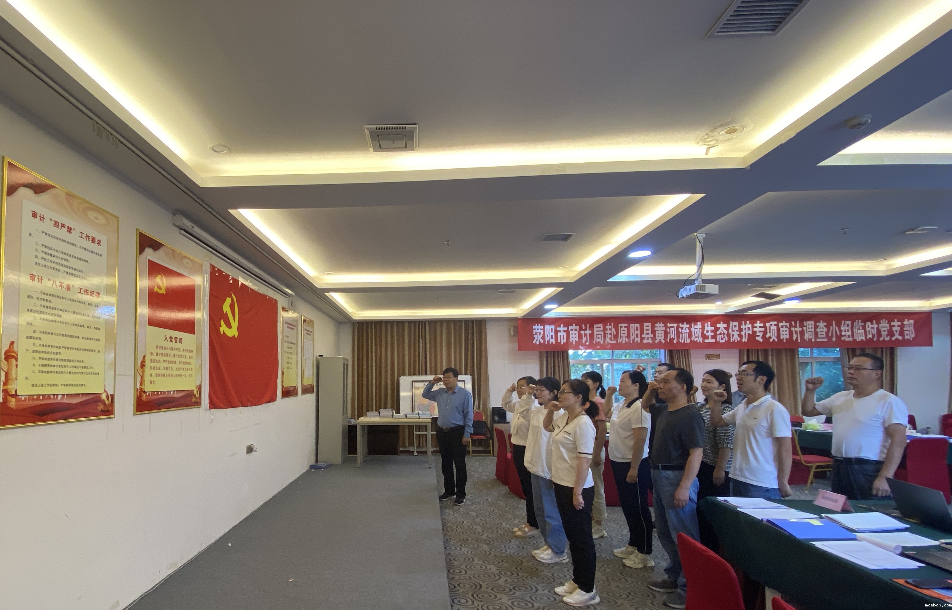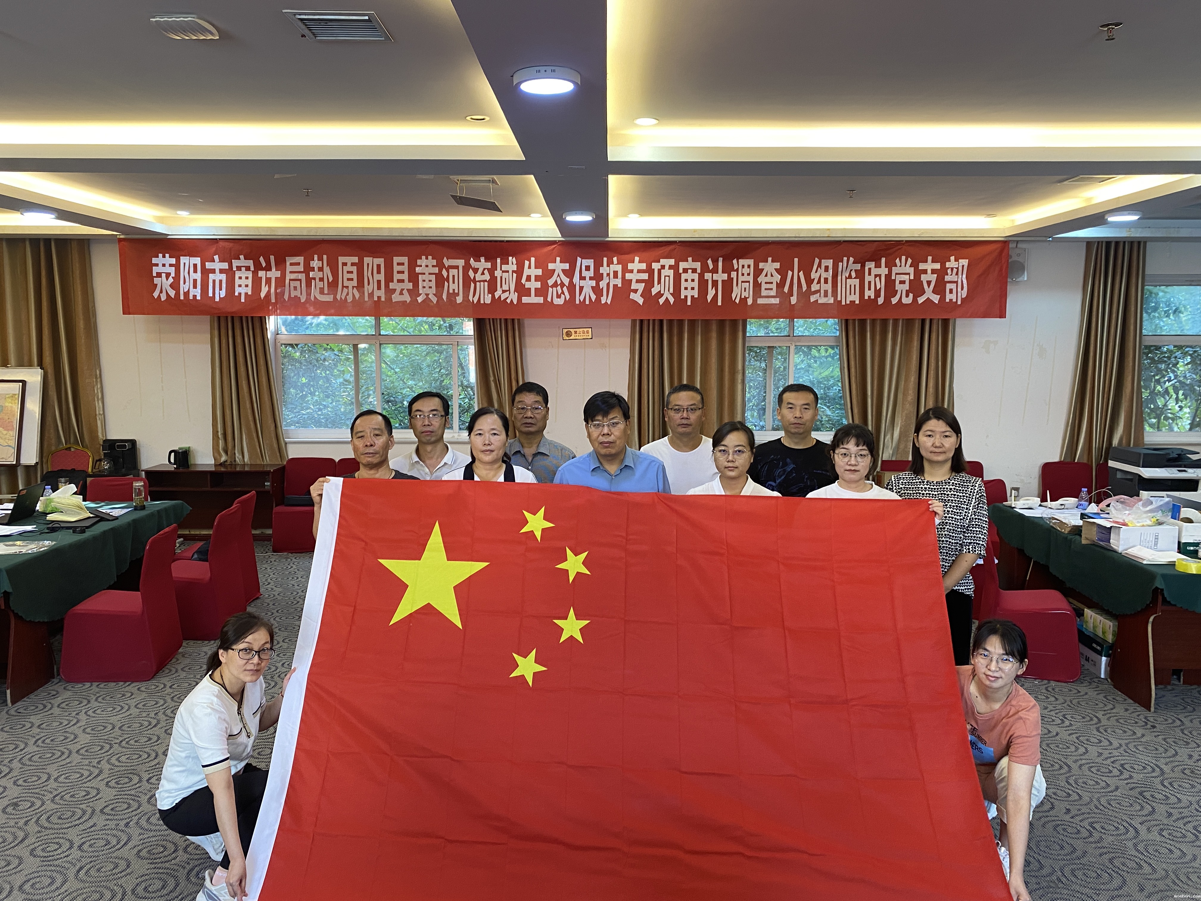 喜迎国庆,共庆华诞。9月28日上午,荥阳市审计局赴原阳县黄河流域生态保护专项审计调查小组临时党支部开展“我与国旗合张影,我为祖国送祝福”活动,小组成员们纷纷与国旗合影、向国旗敬礼,重温入党誓词,表达自己对党和对祖国的赤诚之心与无限热爱。通过此次主题活动,进一步激发了党员干部的爱国情怀,审计组成员将以更加饱满的工作热情和积极向上的精神状态投入到黄河流域生态保护专项审计工作中去,以优异的工作成绩迎接新中国成立七十三周年和党的二十大胜利召开。(起草人:陈方圆 审核人:吴敏生)