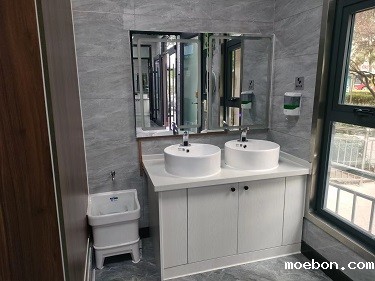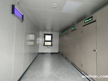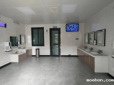 装配式公厕门口处设置了防滑大理石台阶和无障碍通道;内部设有男女厕间、第三卫生间、工具间、管理间,第三卫生间内设置了呼叫按钮,为残障、婴幼、老弱等群体提供便利;公共区域设置有智能面镜、感应洗手装置、手部烘干机;厕间的通风采光窗能够保证空气流通无异味,为市民提供一个清新舒适的如厕环境;公厕还配备了中央空调、新风系统与智慧厕所管理系统,市民一迈进门,只要看墙上屏幕,厕位使用情况就一目了然。