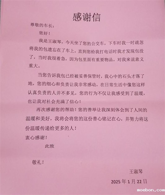 王女士说道:“22号那天从10路公交车下来的时候我自己都忘了我的包丢到车上了,直到咱车长李师傅给我打电话联系我才想起来我的包丢了,当时我真是非常着急,因为包里装了很多重要物品,李师傅给我说他把包交给到咱公交调度室了,放到那可安全,我随时都可以去取,咦,我心里头可不紧张也不着急了,要不是李师傅这么细心给我东西找到了还收起来了,这大过年的,我还真是没办法了,真是太感谢咱司机了!”当工作人员告知李俊锋车长,王女士特意给他送来一封感谢信后,李俊锋车长说道:“这都是我们应该做的,保管好乘客的遗失物品也是我们公交人的职责,当时车到终点站后,我照例对公交车厢检查,发现车座上有一个包,当时想到失主发现包丢了之后肯定非常着急,我就赶紧把包给送到调度室里,发现包内有重要证件和三千多元现金,还好从包里找到了失主的联系方式,我就赶紧跟失主联系让她来调度室取包。”
