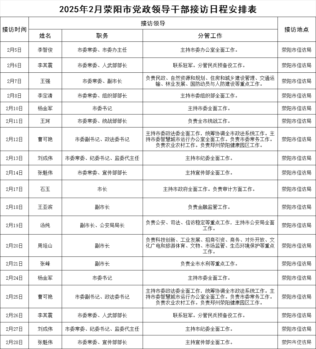 为深入贯彻习近平总书记关于信访工作重要指示精神,进一步畅通信访渠道,及时解决信访问题,维护群众合法权益,现将2025年2月份荥阳市党政领导干部接访时间予以公布。