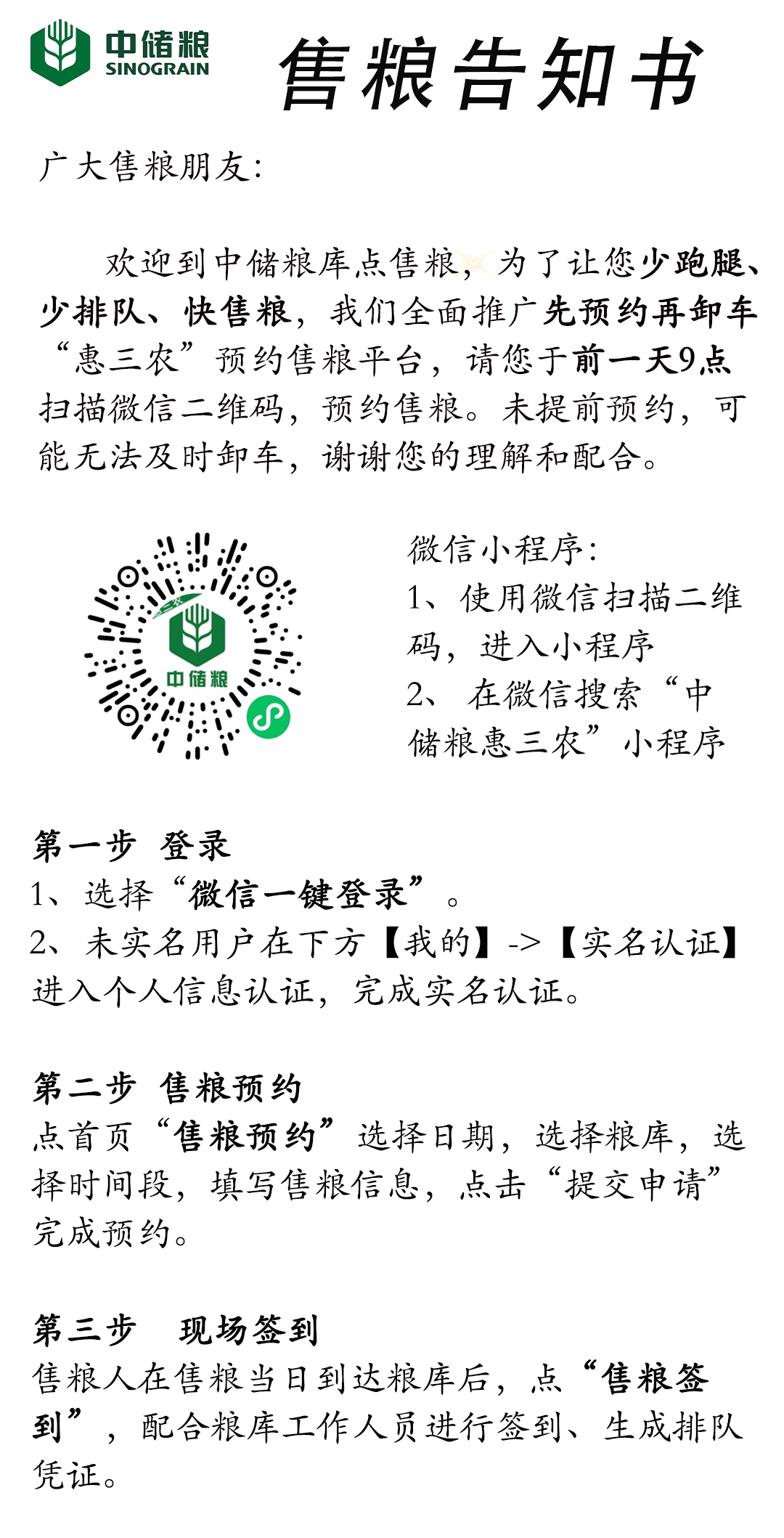 注:为方便广大售粮人,减少排队等待时间,请提前二维码预约售粮。
