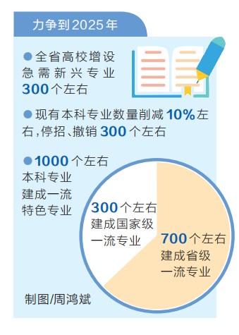 指导意见提出,要积极发展新兴学科专业,改造提升传统学科专业,打造特色优势学科专业,力争到2025年,全省高校增设急需新兴专业300个左右;现有本科专业数量削减10%左右,停招、撤销300个左右;1000个左右本科专业建成一流特色专业,其中300个左右建成国家级一流专业,700个左右建成省级一流专业。