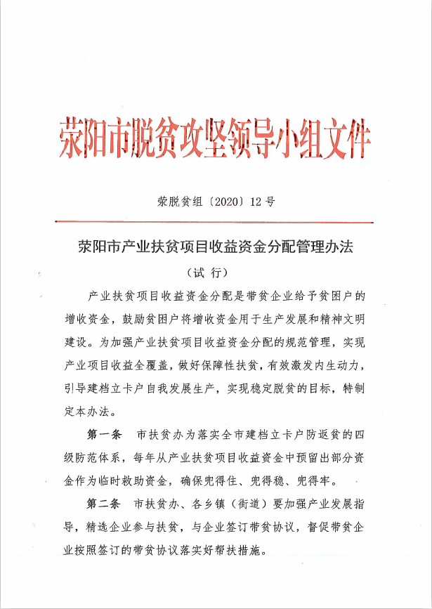 荥阳市产业扶贫项目收益资金分配管理办法