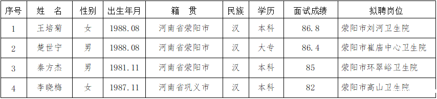 按照《2020年度荥阳市招聘特岗全科医生工作公告》,结合个人申报岗位,根据面试成绩、体检结果及考察结果,现将2020年特岗全科医生拟聘用人员进行公示。