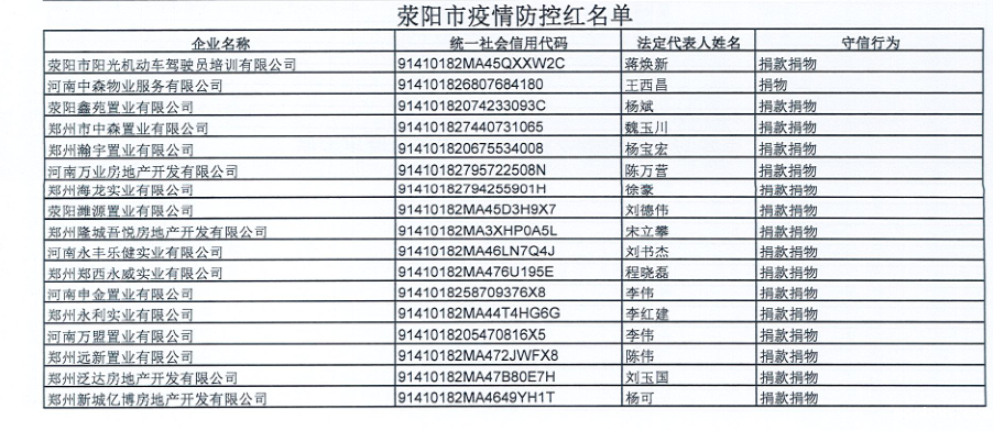 2020年5月6日,《郑州市疫情防控期间红名单》在“信用郑州”网站发布,此次郑州市共归集防疫期间红名单459条,其中荥阳市阳光机动车驾驶员培训有限公司、河南中森物业服务有限公司等共计29家荥阳企业因向疫区捐款或者捐物等行为被列入郑州市疫情防控期间红名单。被列入疫情防控工作社会信用红榜名单的企业或者组织,将在政府政策扶持、评优评先等方面享受惠民便企政策。民无信不立,国无信不强。荥阳市全体人民和全国人民一道诚信先行,共同抗疫。