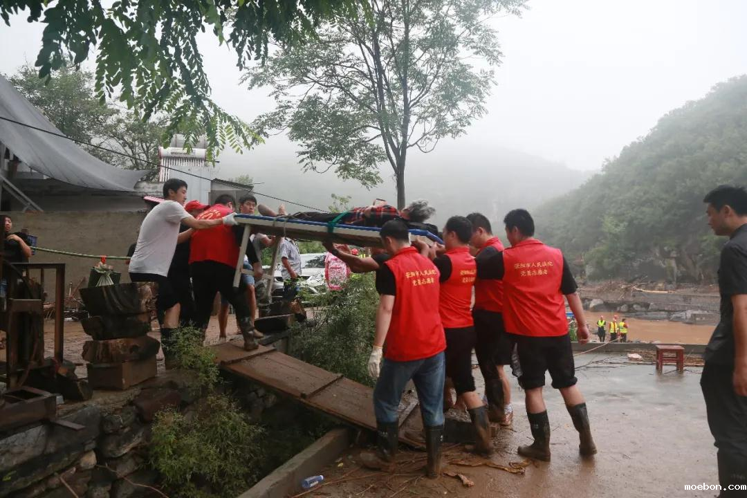 在下午搬运第二趟返回途中,恰逢救援队从一户老百姓家中救出一名行动不便老人,需要送往近2公里的大门口。法院志愿者虽然都很疲惫,还是二话不说,主动揽下了这项“大活”。老人被固定在一个架子上,体积比较大,其中要穿过几个狭窄的通道,还有各种爬坡、趟泥、涉水,难度极大,但是志愿者们毫无怨言,大家轮流上阵,终于将老人安全送到指定地点。