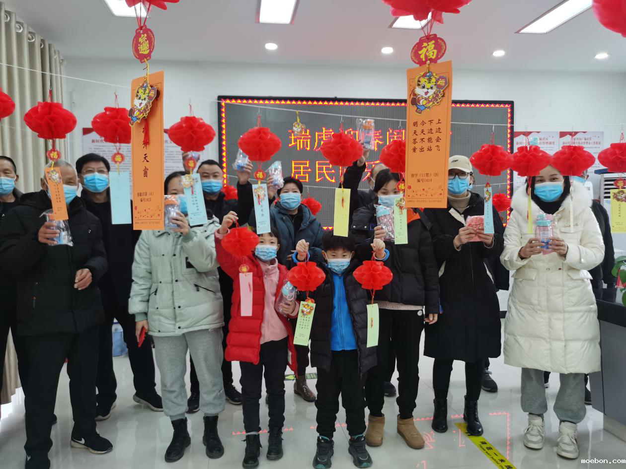 活动现场,红色灯笼随风飘荡,屋顶上到处悬挂着写有谜语的彩色纸条,工作人员精心准备的礼物则整整齐齐的摆放在一侧。灯谜中不仅有大家喜闻乐见的字谜、猜成语、歇后语等,还结合党建知识、社会主义核心价值观、创文创卫等知识,制定了难易程度各不相同的谜面,内容丰富多样、有趣而通俗。参与活动的居民高昂着头,有的人双眉紧锁,绞尽脑汁地思考谜底;有的人猜中了谜底,争先恐后地与工作人员核对答案,得知答对后便欢呼雀跃地跑去领取小礼品。现场洋溢着欢乐、祥和、喜庆的气氛。