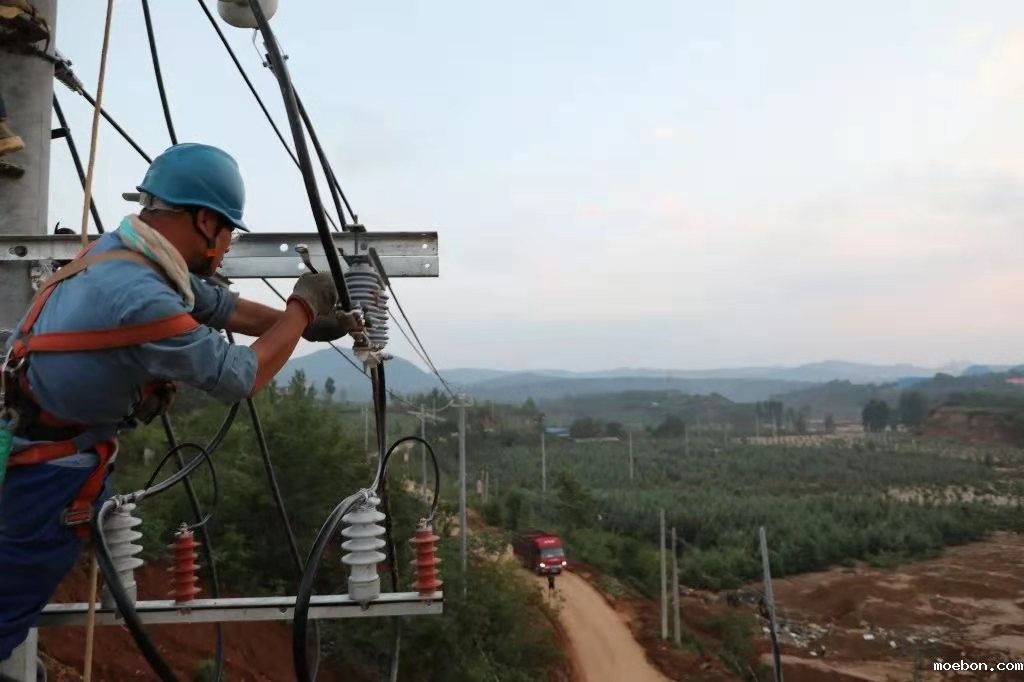 崔庙镇郑庄村位于荥阳市南部浅山丘陵地带,在此次暴雨灾害中,位于该村西侧的邵34板邵郑线线杆倒了好多,供电中断。为了尽快恢复供电,荥阳市供电公司的施工人员在东侧高地边缘新栽了10根线杆,从新310国道南侧的洞5板梁沟线下火取电。