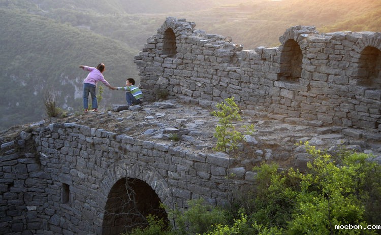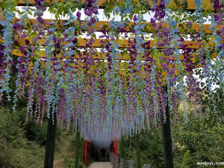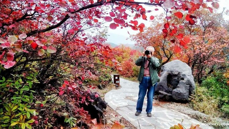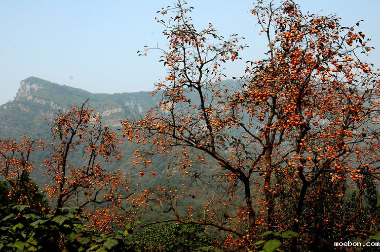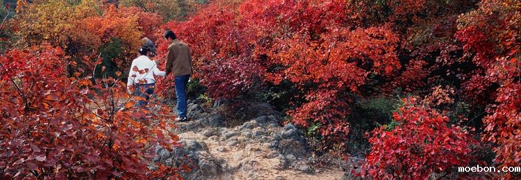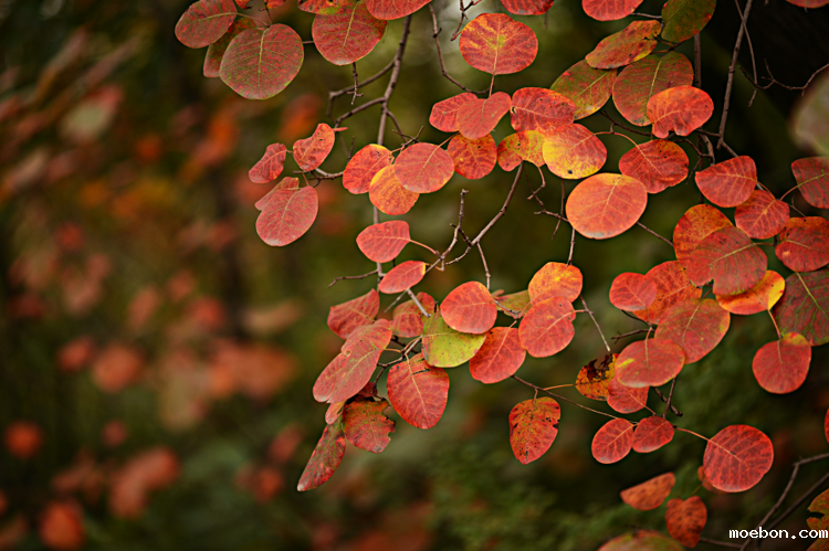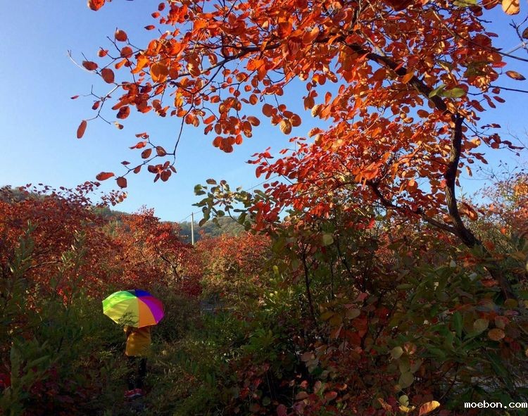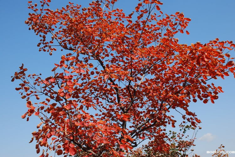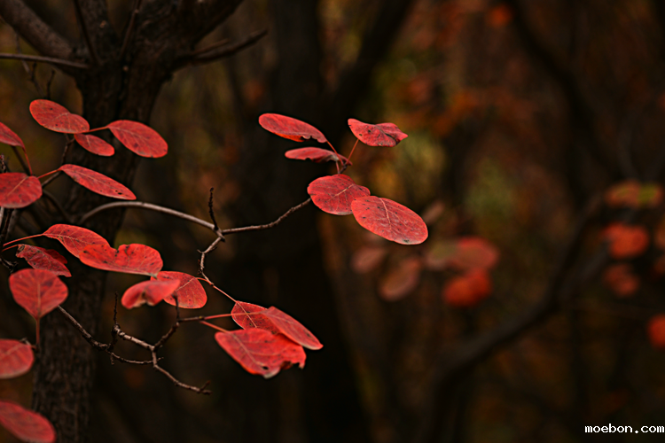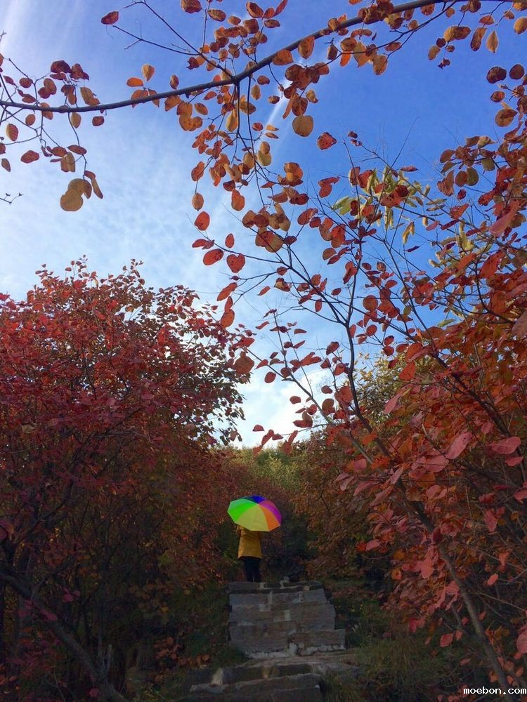 方圆几十平方公里的环翠峪,遍布百十万株黄栌, 站在山脚向山上望去,一簇簇的红叶、彩叶从山下蔓延到山顶,鲜红的娇艳欲滴,紫红的流光溢彩,深红的灿若晚霞,加之青松翠柏的映衬,整个环翠峪,宛如一幅美丽的油画。拾阶而上,火红的黄栌,或点缀于青松翠柏之间,或丛生于石阶步道两侧,或悬挂于峭壁悬崖之上,浓密处树树交错,叶叶相连,层层叠叠;稀疏处若水上玫瑰,晶莹剔透,如玑似玉;如千万只彩蝶追逐飞舞,姿态万千,绚丽多彩,让人陶醉。