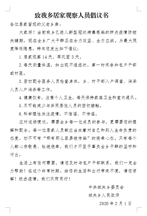 非常时期,城关乡行非常之举!2月1日,城关乡倡议全乡居家留观人员隔离14天后再巩固3天。