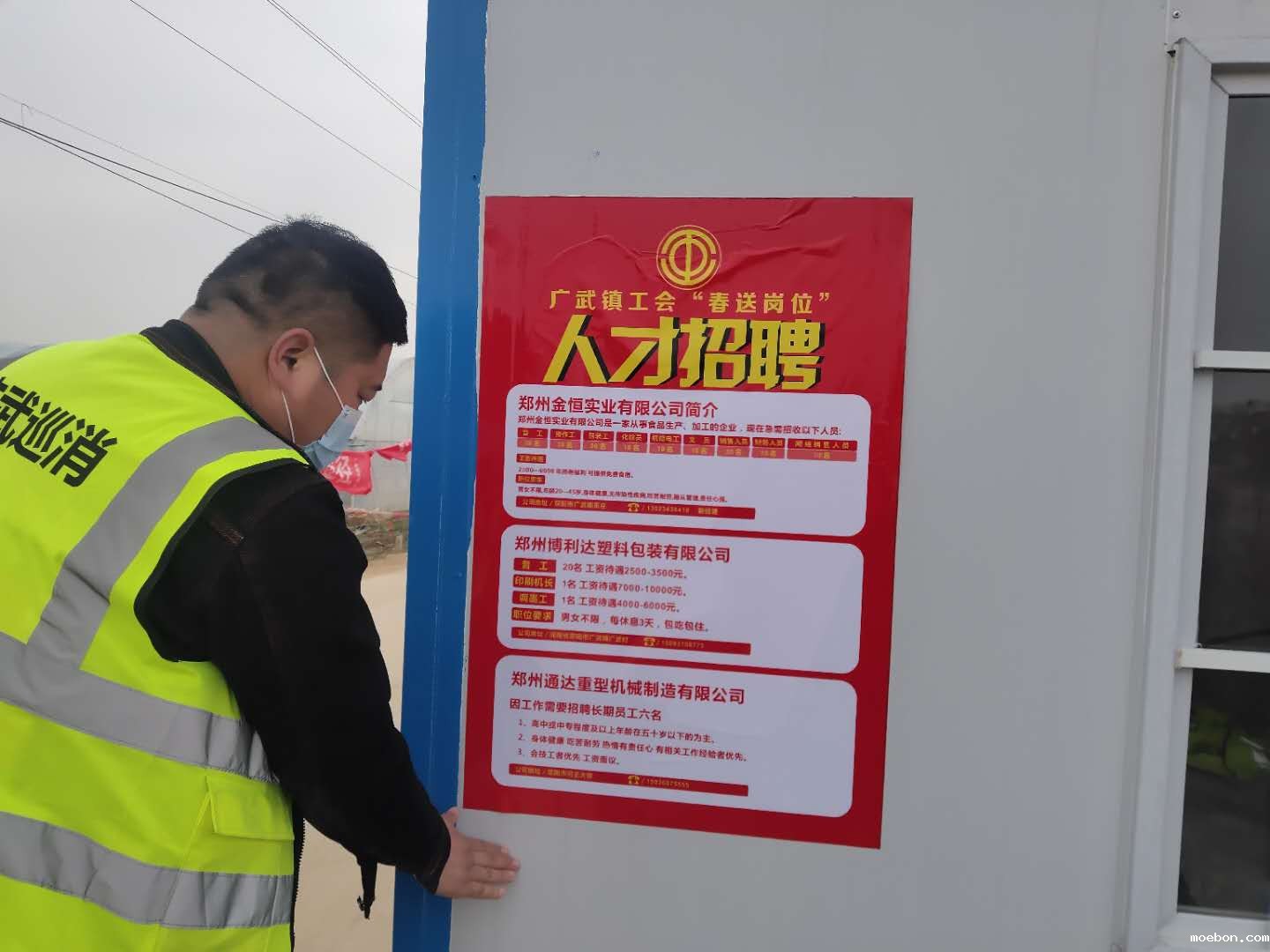 “受疫情影响,今年用工形势严峻,以前前来打工的工人来不了,造成复工后人员短缺,这次活动明显解决了本企业复工复产的最大难题。”金恒实业的靳经理尤为高兴。丁洼村村委也反映“目前村民们都急得自己去厂里找工作了,要养一大家子人真的不容易。”为进一步服务和保障企业用工,广武镇工会在全镇范围内组织开展“春送岗位”活动,鼓励引导群众就近就业。镇工会对辖区内复工复产企业缺工情况、计划招聘人数、招聘工种、薪酬待遇等岗位需求信息进行全面调查摸排,通过网络、短信、在各个防疫服务站张贴招聘海报等形式,广泛发布适合辖区群众就近就业的岗位信息,帮助招聘企业和应聘者精准对接。