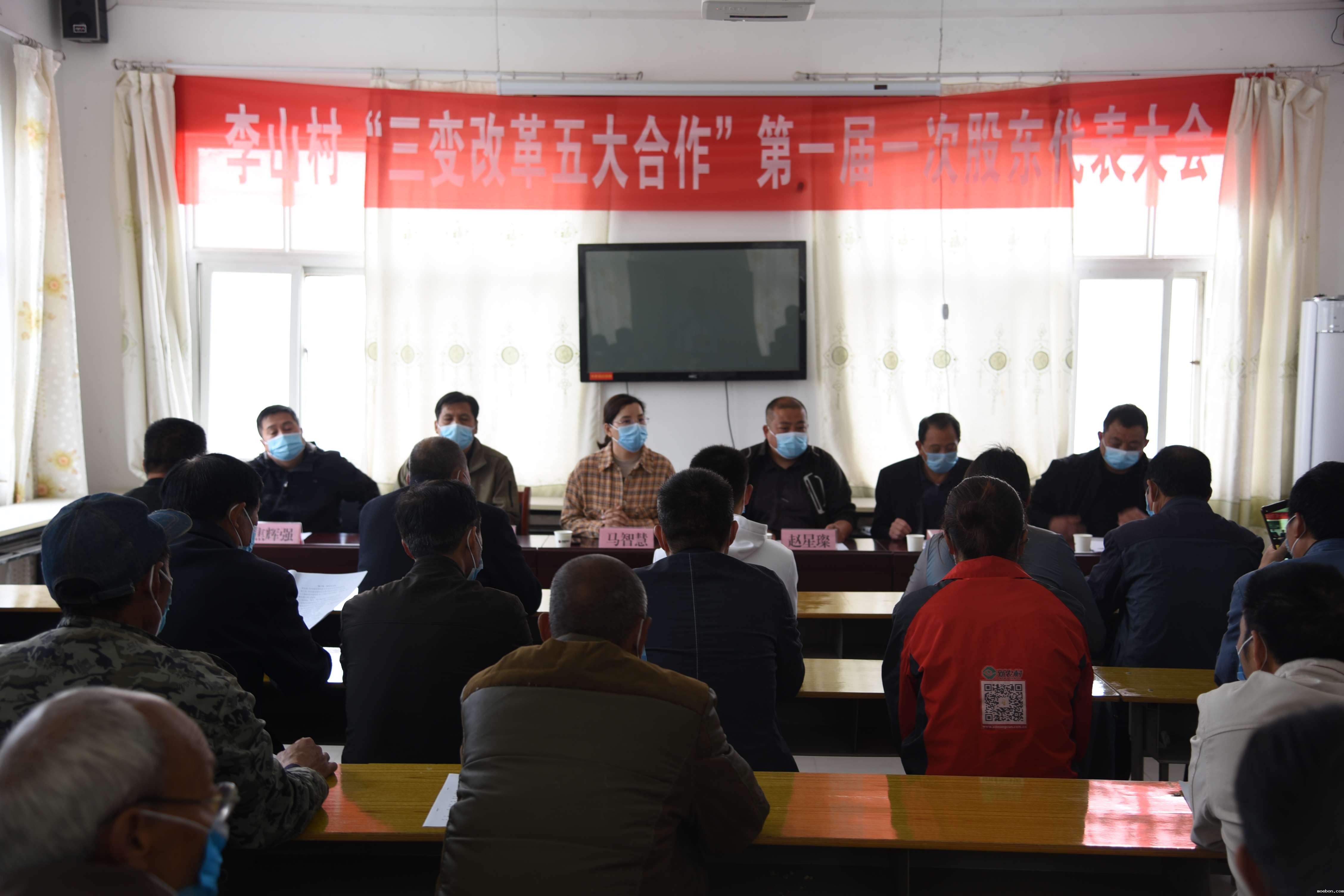 4月27日上午,高村乡首个“三变改革、五大合作”试点村第一次股东代表大会在李山村党群服务中心举行,党委副书记、乡长马智慧,党委委员、纪委书记赵星璨,荥阳市农经站站长魏根奎,李山村第一届股东代表参加仪式。