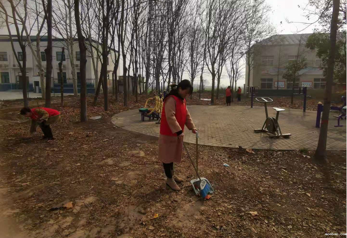 在高村乡政府文体活动广场,新时代文明实践志愿者们按照责任分工,正在各自部门分包的区域内铲除杂草,清理枯叶、捡拾垃圾、擦拭宣传栏和健身器材,打造一个环境优美、干净整洁的活动场所,供大家在工作之余锻炼身体、愉悦身心。